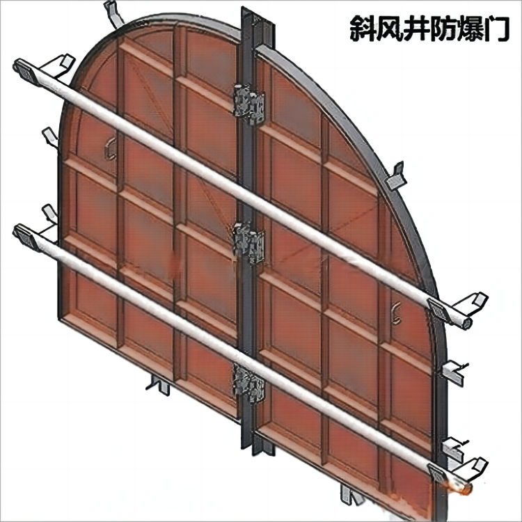 斜井防爆门主要用于矿山斜风井口。当井下发生时,冲击波将该防爆门向外冲开,起到释放并缓解斜风井冲击波的作用。