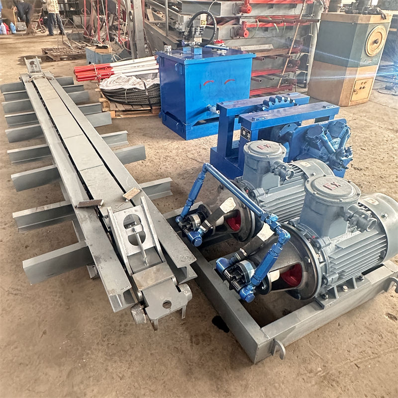 (1)销齿式推车机由一列可以在轨道上运行的销车组成,整套装置采用液压动力,由低速大扭矩液压马达直接驱动齿轮转动,再通过齿轮传动来实现销车的运行。